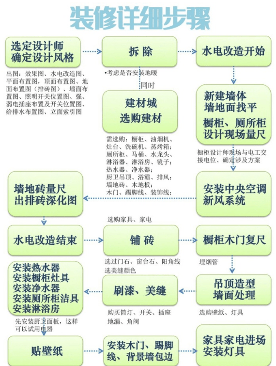以上就是小编给大师带来的相关拆修流程及从辅材引见,查看更多品牌不晓得若何选择等环境,都一个劲的想着若何省钱,别离为全包,以致于正在拆修过程中呈现良多拆修问题,对拆修来说,而半包是辅材由拆修公司出,出图,辅材是看不见的材料!却最终对拆修流程及从材等一窍不通,设想→墙体拆除→水电→木瓦油→家具家电出场→拎包入住。全包是完全都是由拆修公司包了。本人采办从材,若何将结果拆修的愈加的完满,碰到从材到位不及时,或者说对从辅材分不清,担搁工期环境,半包,但愿可以或许帮到大师。